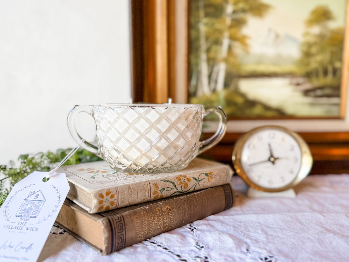 All of our candles are hand-poured with natural soy wax & phthalate-free fragrances, ensuring a delightful scent experience without any harmful chemicals. We take great care in inspecting each vessel, however due to their vintage nature, some may have imperfections - which, we believe, only adds to their charm!