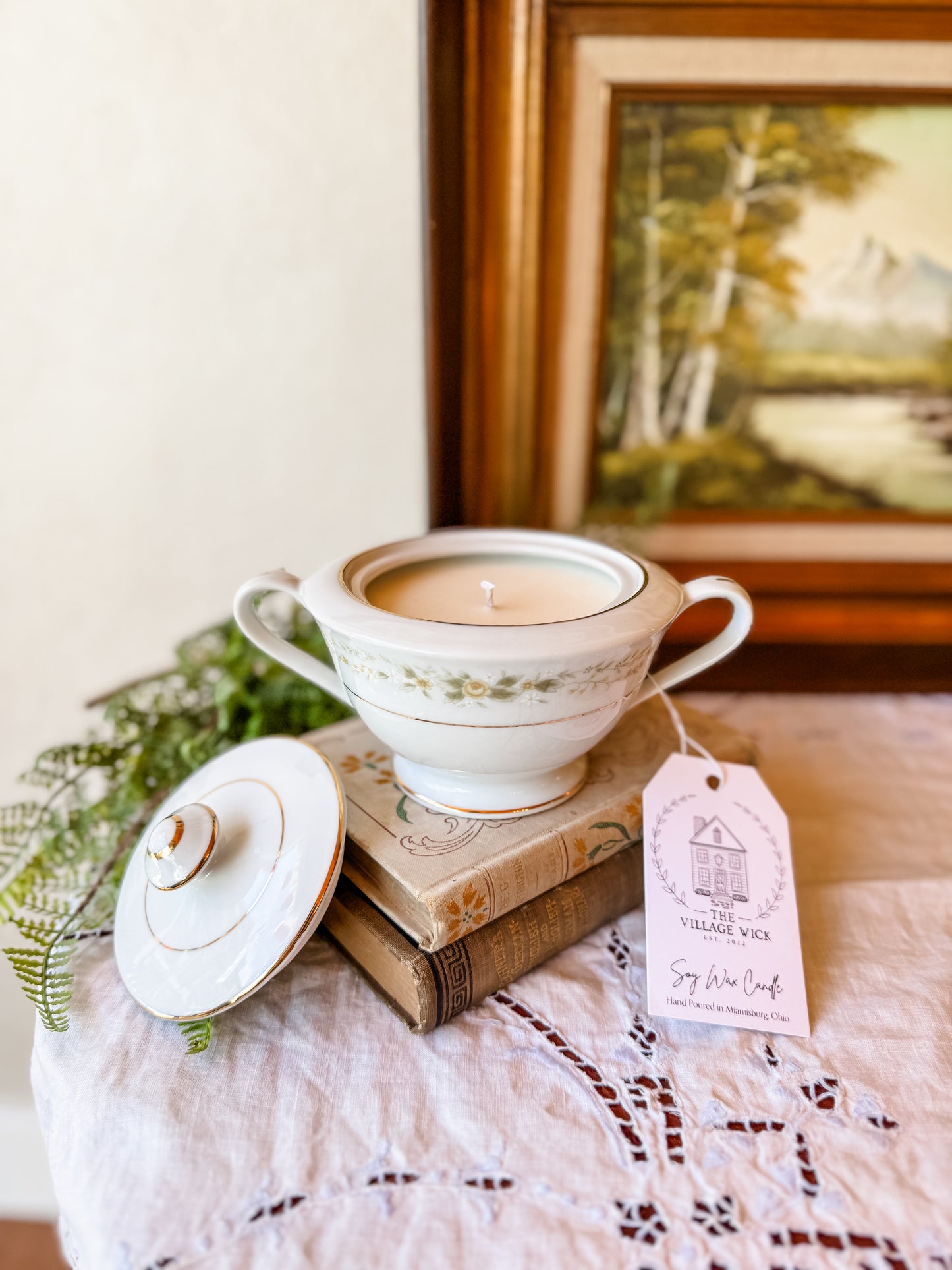 Timeless elegance meets effortless style in this one-of-a-kind vintage sugar bowl candle, hand-poured in a delicate porcelain vessel made in Japan. Featuring the classic Waverly pattern with graceful gold trim accents along the rim and lid, this piece brings a touch of refined charm to any space.